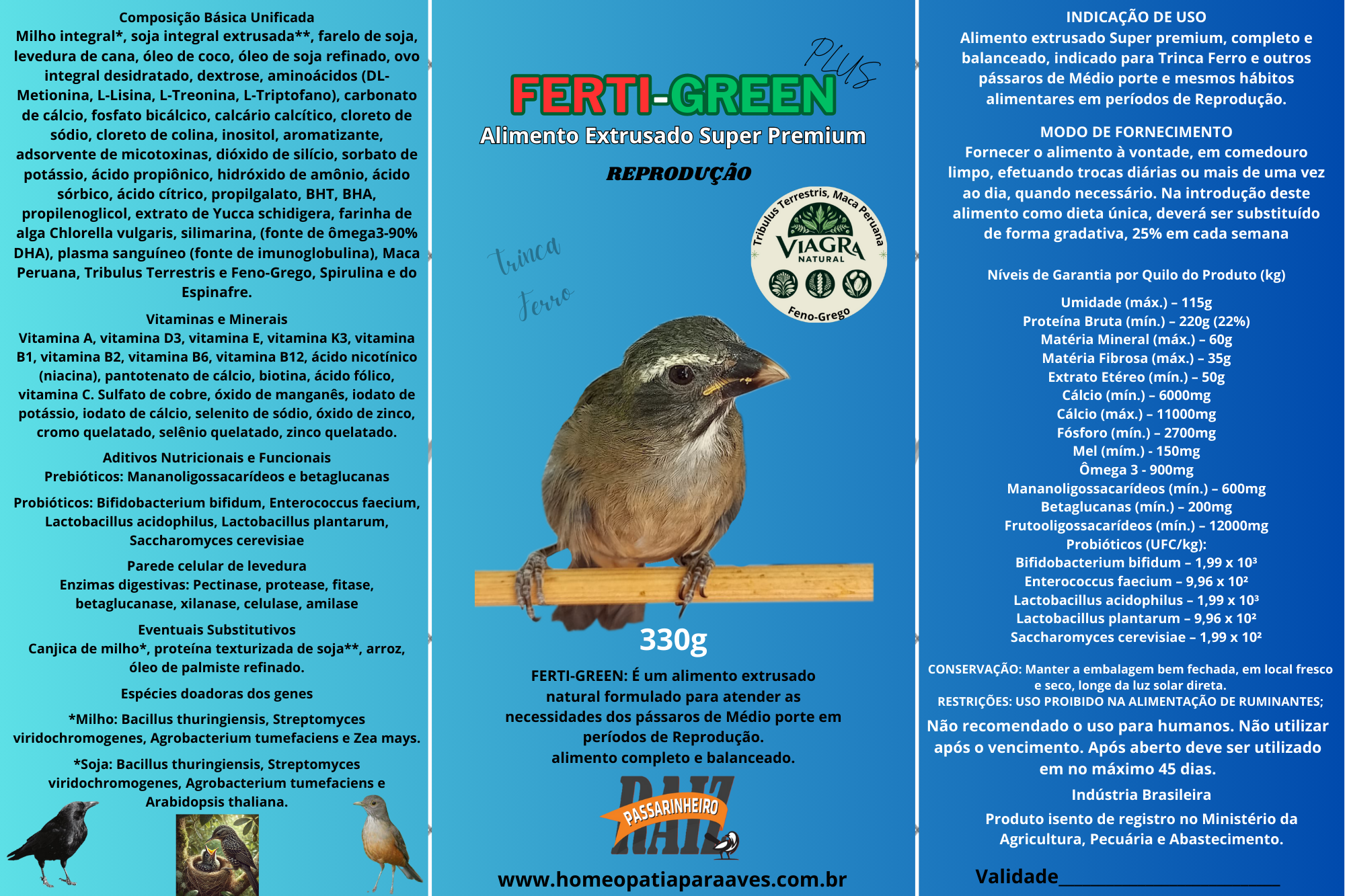 FERTI-GREEN: É um alimento extrusado natural formulado para atender as necessidades dos pássaros de Médio porte em períodos de Reprodução.