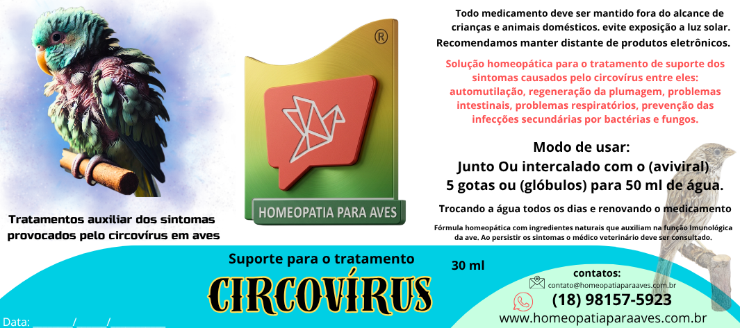 Solução homeopática indicada como suporte no tratamento dos sintomas e quadros associados ao circovírus em aves, auxiliando o organismo nos seguintes desafios: