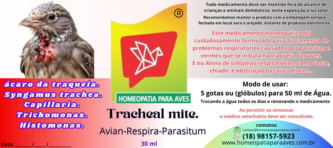 Tracheal Mite Avian-Respira-Parasitun é uma fórmula homeopática especialmente desenvolvida para combater e prevenir infestações de vermes e parasitas que afetam o sistema respiratório de aves, incluindo traqueia, pulmões e sacos aéreos. Com uma combinação única de medicamentos homeopáticos, Tracheal Mite Avian-Respira-Parasitun promove a eliminação de parasitas, alivia sintomas respiratórios e fortalece o sistema imunológico, garantindo saúde e vitalidade para suas aves.
